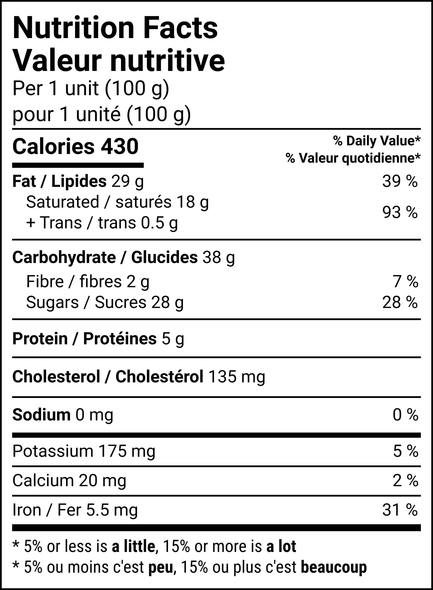 Chocolat noir (pâte de cacao, sucre, beurre de cacao, lécithines de soja, arôme naturel de vanille), Œuf de poules élevées en plein air, Sucres (sucre, caramel à la crème fraîche (sucre, crème fraîche, sel de Guérande IGP*), dextrose), Beurre concentré, Farine de blé, Lait écrémé en poudre réhydraté, Adipate de diamidon acétylé, Amidon, Mono- et diglycérides d'acides gras, Alginate de sodium, Pectines.* Indication Géographique Protégée.