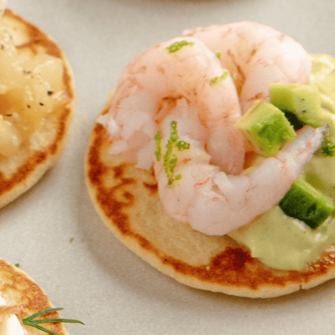 Tender Nordic shrimp and creamy avocado-lime mayo top fluffy mini blinis for a fresh and flavourful bite.10mn4 personnes -